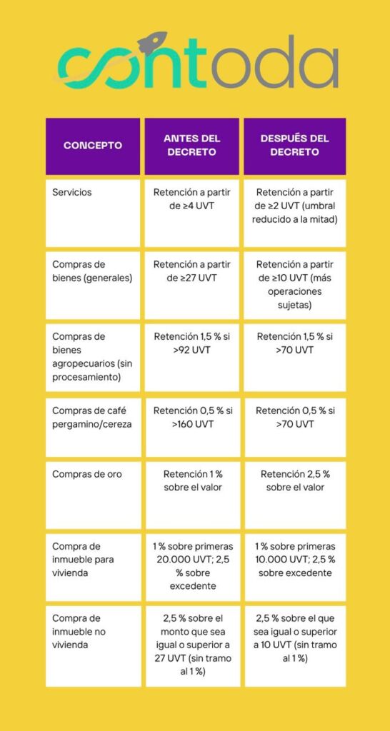 A continuación se resumen en una tabla las modificaciones más relevantes en cuantías mínimas y tarifas de retención en la fuente